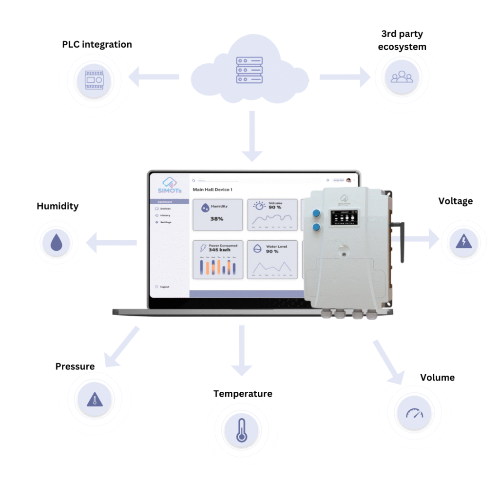 SIMOT is an IoT module for industrial data acquisition with 4x to 8x analog and digital data channels, and 2x digital inputs PLC standard, 2x digital outputs PLC standard for full transmitter compatibility and secure cloud or private cloud connectivity. Our IoT module is fully compatible with Wi-Fi, BLE, Ethernet, RS485 and communication protocols likeWebSockets, ModbusRT ModbusTCP and RestAPIs.